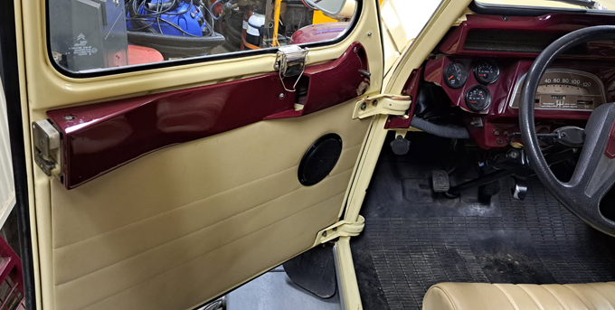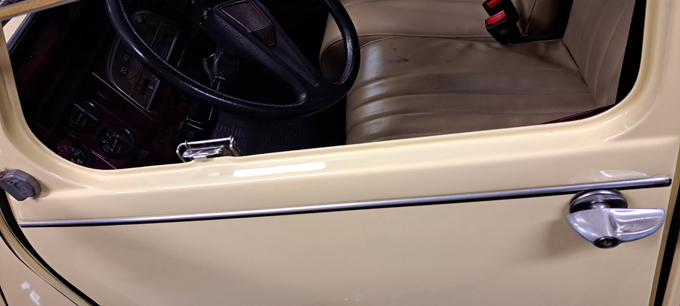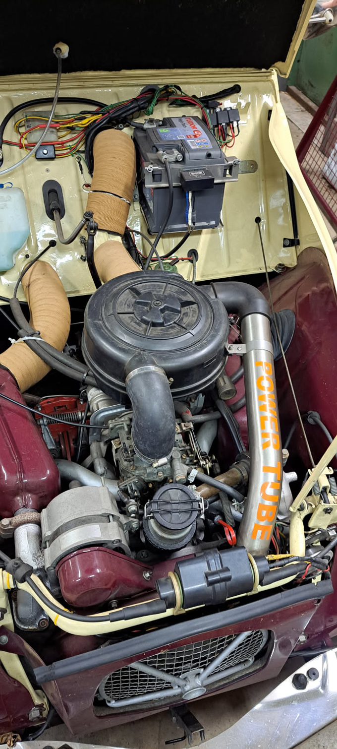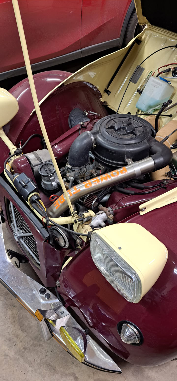 Bilen är mycket fin och lackerad i Dolly-färgerna Jaune Rialto / Rouge Delage och motorn är uppgraderad till 652 cm3